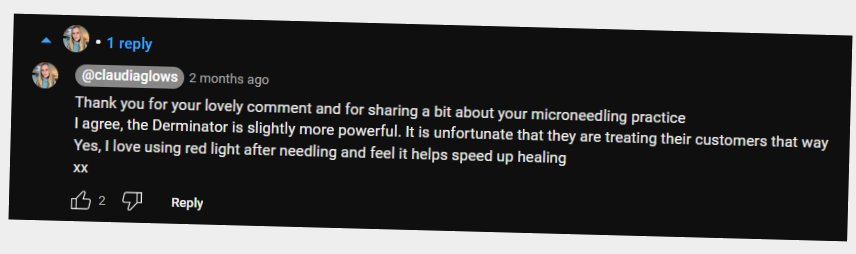 The funny thing is that the comments underneath her defamatory video all agree that the Derminator is superior to Dr. Pen in all respects. Power, pain etc.